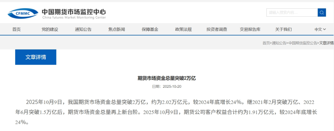 10月20日,中國期貨市場監(jiān)控中心發(fā)文稱,2025年10月9日,我國期貨市場資金總量突破2萬億元,約為2.02萬億元,較2024年底增長24%。繼2021年2月突破萬億、2022年6月突破1.5萬億后,期貨市場資金總量再上新臺階。2025年10月9日,期貨公司客戶權(quán)益合計(jì)約為1.91萬億元,較2024年底增長24%。業(yè)內(nèi)人士認(rèn)為,期貨市場資金總量持續(xù)增長,迭創(chuàng)新高,反映出我國期貨市場高質(zhì)量發(fā)展進(jìn)一步邁出堅(jiān)實(shí)步伐,品種體系不斷健全,各類客戶廣泛參與,期貨市場價(jià)格發(fā)現(xiàn)、風(fēng)險(xiǎn)管理和資產(chǎn)配置功能得到更廣泛認(rèn)同和更有效發(fā)揮,期貨市場服務(wù)國民經(jīng)濟(jì)高質(zhì)量發(fā)展的能力穩(wěn)步提升。事實(shí)上,今年以來,期貨市場延續(xù)良好的發(fā)展態(tài)勢。近日,中國期貨業(yè)協(xié)會公布的統(tǒng)計(jì)資料顯示,以單邊計(jì)算,9月全國期貨交易市場成交量為770.21百萬手,成交額為71.50萬億元。今年前三季度,全國期貨市場累計(jì)成交量為6744.16百萬手,累計(jì)成交額為547.62萬億元,同比分別增長18.29%和24.11%。與此同時(shí),我國期貨市場客戶規(guī)模保持穩(wěn)健增長態(tài)勢,市場吸引力與國際化水平進(jìn)一步提升。中國期貨市場監(jiān)控中心數(shù)據(jù)顯示,截至2025年9月末,全市場有效客戶數(shù)已突破270萬個(gè),較去年同期增長14%。2025年前三季度,市場累計(jì)新增客戶65萬個(gè),客戶基礎(chǔ)穩(wěn)步增強(qiáng)。從結(jié)構(gòu)上看,機(jī)構(gòu)客戶延續(xù)平穩(wěn)增長態(tài)勢,同比增幅3%;境外客戶增長更為顯著,同比增幅達(dá)11%,交易者分布于40個(gè)國家和地區(qū)。客戶規(guī)模的穩(wěn)步增長以及客戶結(jié)構(gòu)的持續(xù)優(yōu)化,為期貨市場高質(zhì)量發(fā)展奠定了堅(jiān)實(shí)基礎(chǔ)。在客戶需求日益多元化的驅(qū)動下,我國期貨市場品種體系日益豐富,對外開放水平穩(wěn)步提高,服務(wù)實(shí)體經(jīng)濟(jì)方面的能力進(jìn)一步增強(qiáng),高質(zhì)量發(fā)展步伐更加堅(jiān)實(shí)。業(yè)內(nèi)人士表示,期貨市場服務(wù)實(shí)體經(jīng)濟(jì)能力和價(jià)格影響力穩(wěn)步提升。數(shù)據(jù)顯示,今年8月底,期貨市場法人客戶持倉占比達(dá)65.34%,較2020年增加7.94個(gè)百分點(diǎn)。期貨已成為很多產(chǎn)業(yè)企業(yè)經(jīng)營“必需品”,大部分期貨品種已成為境內(nèi)貿(mào)易定價(jià)基準(zhǔn),原油等對外開放品種已具備一定的國際定價(jià)影響力,為助力企業(yè)提升跨境經(jīng)營能力發(fā)揮了積極作用。